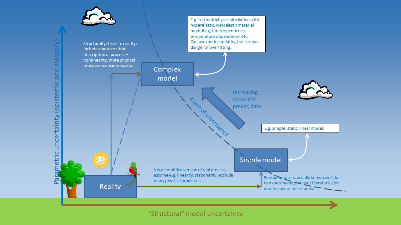 This is a slightly whimsical slide that I’ve used in the past to elaborate on this problem. A simple model is further away from reality in terms of “structural uncertainty”, i.e. the uncertainty due to the fact that the model simplifies the complexities of the real system. But there is actually less uncertainty in its parameters because there are less parameters. In the linear model, there are only two parameters.