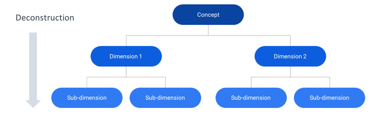 By doing this, some main components of your concept should become clear: let’s call these dimensions . Now each dimension has to be carefully examined – does it have clear sub-dimensions? If so, these can also be added to your conceptual framework. The sub-dimensions themselves may have sub-sub-dimensions, and so on.