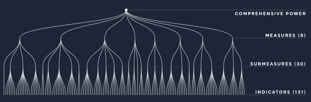 Other indexes are more complex. The Lowy Institute Asia Power Index framework, pictured below, is comprised of eight “measures” which are in turn comprised of 30 “submeasures” and 131 underlying indicators. This framework has four levels.