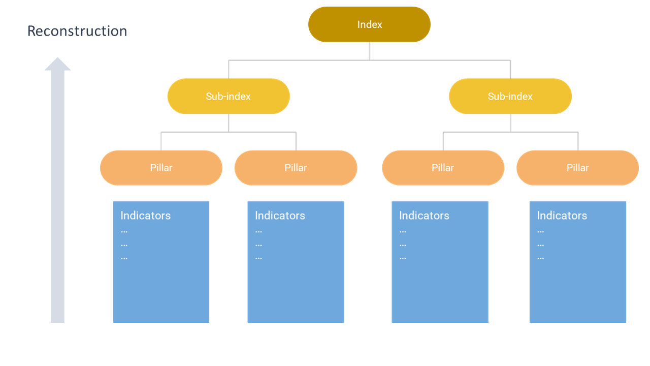 Last, but absolutely not least, is the issue of data availability. While we can certainly arrive at a “theoretical” conceptual framework using the ideas above, if we want to actually populate this with indicators, we will probably have to make adjustments. Quite often, data is lacking for key components of the framework. There is little point including a sub-dimension for which little or no data is available, and the final conceptual framework of the index will almost always be shaped by which indicators are practically available. That said, pointing to data gaps can also be a useful strategy for spurring future data collection.