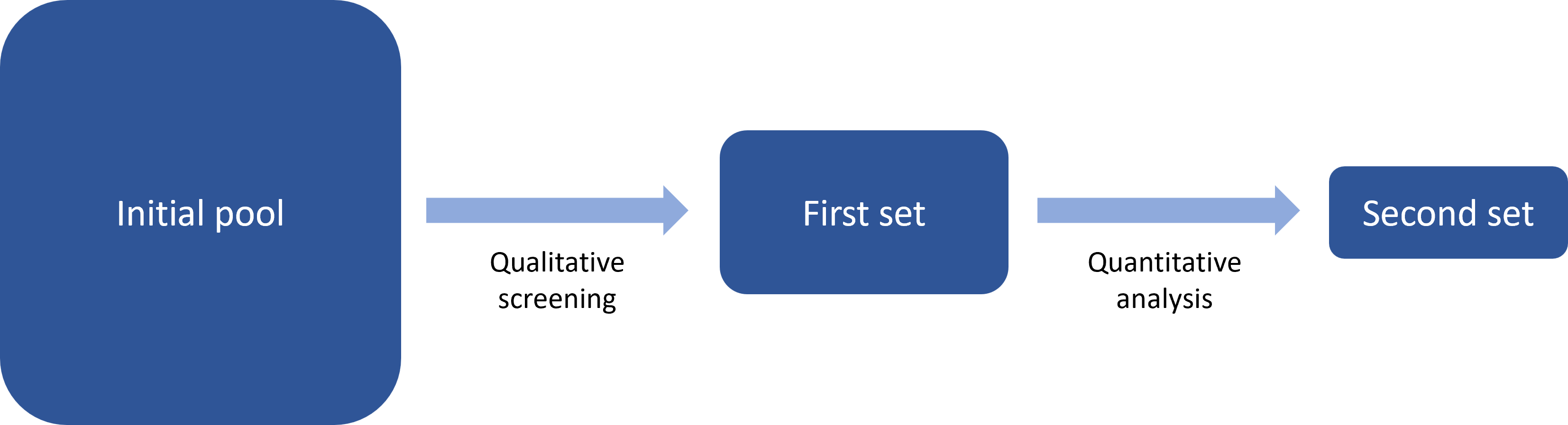 Here, the “initial pool” is a wider set of possible indicators, for which data has not yet necessarily been collected. This is first narrowed down to a “First set” of indicators which are realistic and satisfy basic qualitative properties. Then, after data collection, a quantitative analysis can help to narrow down the set yet further to the “Second set”. The sizes of the boxes are roughly meant to represent the numbers of indicators at each stage.