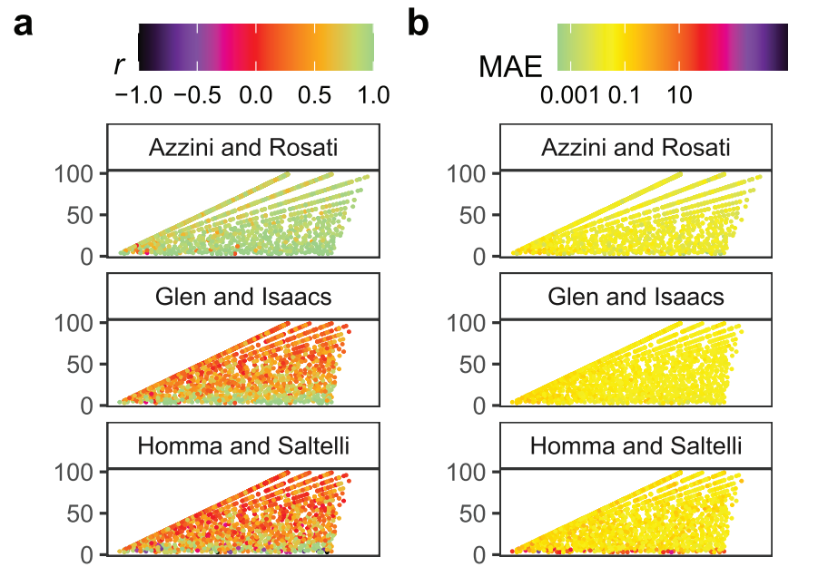 Sensitivity analysis helps identify which model inputs convey the most uncertainty to the model output. One of the most authoritative measures in global sensitivity analysis is the Sobol’ total-order index, which can be computed with several different estimators. Although previous comparisons exist, it is hard to know which estimator performs best since the results are contingent on the benchmark setting defined by the analyst (the sampling method, the distribution of the model inputs, the number of model runs, the test function or model and its dimensionality, the weight of higher order effects, or the performance measure selected). Here we compare several total-order estimators in an eight-dimension hypercube, where these benchmark parameters are treated as random parameters. This arrangement significantly relaxes the dependency of the results on the benchmark design. We observe that the most accurate estimators are from Razavi and Gupta, Jansen, or Janon/Monod for factor prioritization, and from Jansen, Janon/Monod, or Azzini and Rosatifor approaching the “true” total-order indices. The rest lag considerably behind. Our work helps analysts navigate myriad total-order formulae by reducing the uncertainty in the selection of the most appropriate estimator.